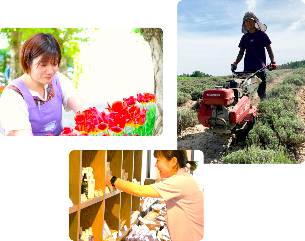 当園ではラベンダーやハーブから作られる、たくさんの商品を販売しています。また、食事に関してもラベンダーソフトクリームやドリンク、メロンパンにカレーなど北海道産の食材や食用に加工したラベンダーを用いて色々なメニューを提供しています。7月には1日の来園者数は10,000人を超えます。園内にあるたくさんの店舗で、短期のアルバイトスタッフと共にお客様をお迎えします。いくら花畑が綺麗でも、お店での応対が悪かったり、掃除が行き届いていなかったりするとお客様の思い出に傷がついてしまいます。店舗のリーダーとしてスタッフをまとめ、販売・飲食と様々な仕事をこなしていけるコミュニケーションを大事に出来る方を歓迎します。