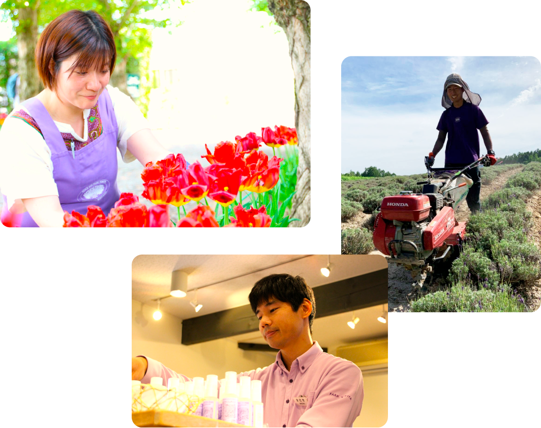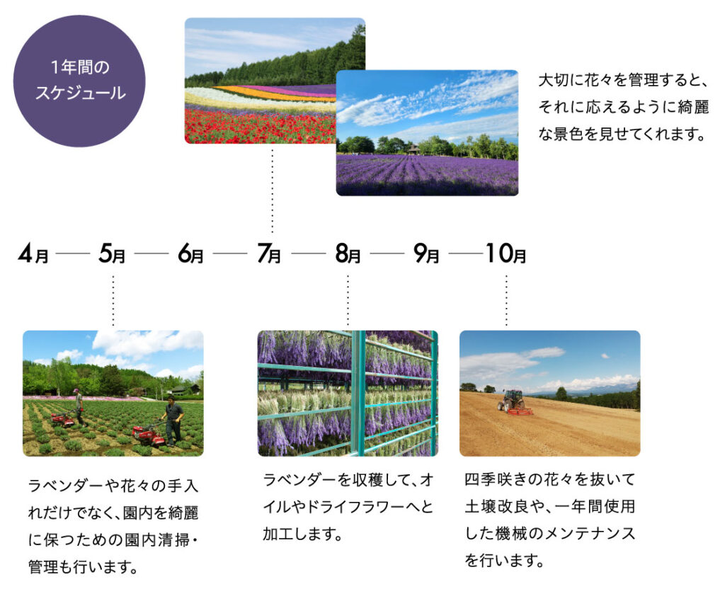 当園ではラベンダーやハーブから作られる、たくさんの商品を販売しています。また、食事に関してもラベンダーソフトクリームやドリンク、メロンパンにカレーなど北海道産の食材や食用に加工したラベンダーを用いて色々なメニューを提供しています。7月には1日の来園者数は10,000人を超えます。園内にあるたくさんの店舗で、短期のアルバイトスタッフと共にお客様をお迎えします。いくら花畑が綺麗でも、お店での応対が悪かったり、掃除が行き届いていなかったりするとお客様の思い出に傷がついてしまいます。店舗のリーダーとしてスタッフをまとめ、販売・飲食と様々な仕事をこなしていけるコミュニケーションを大事に出来る方を歓迎します。