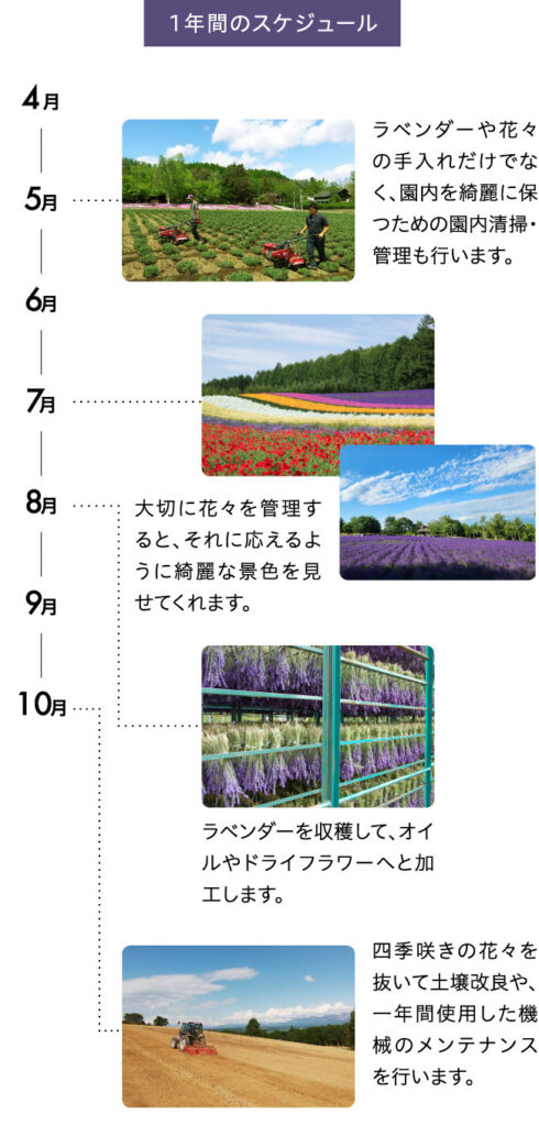 フィールドではラベンダーやサルビアなどの園内で栽培している花々の維持管理を行っています。綺麗な花畑にするためには除草作業はとても重要です。主に手ぐわを用いて株周りを綺麗に除草します。丁寧に除草すると、植物もそれに応えるように感動する景色を見せてくれます。夏を迎えるとラベンダーを刈り取り、収穫し、ドライフラワーやラベンダーオイルとして活用します。他にも美しい園内を維持するために木々の剪定や草刈り、花摘み、園内清掃など仕事は多岐にわたります。天候に左右されたり、思い通りに育たなかったり、管理作業は大変なこともありますが、自然と向き合い、綺麗な花畑が一面に広がった際には「頑張ってよかった」と思わせてくれます。華やかな仕事を想像するかと思いますが、実際の業務は華やかなことばかりではありません。地道な作業を毎日繰り返し行うことで、綺麗な環境を維持しています。これらの業務を、丁寧に毎日続けてくれる人材を歓迎します。